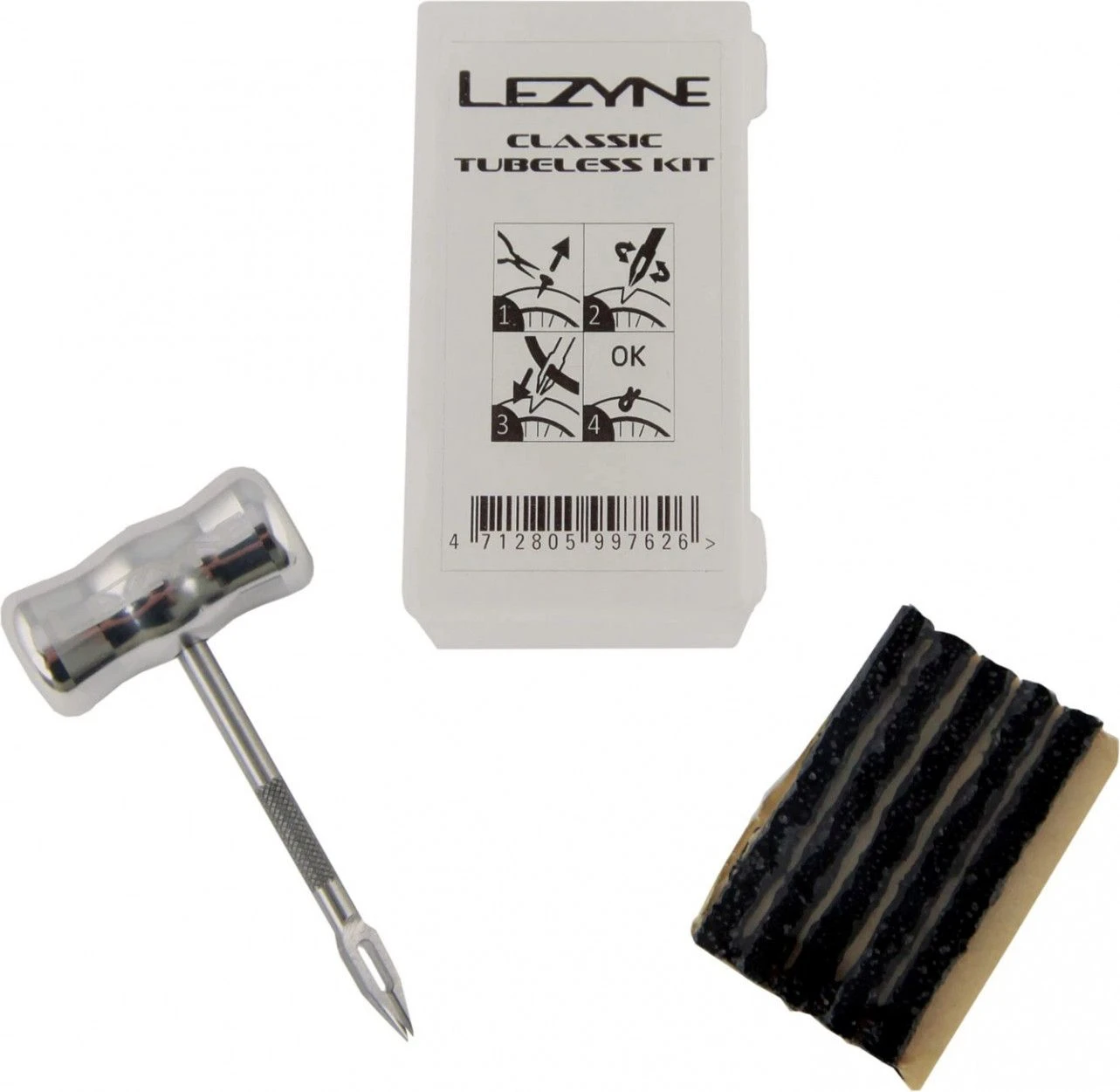 Ultra compact polypropylene case. Kit includes machined aluminum T-handle with combined reamer and insertion tool and five tire plugs.