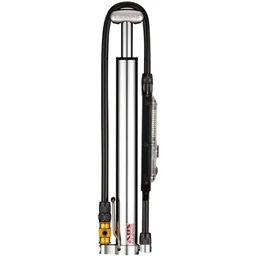 The Micro Floor Drive features a compact design that brings floor pump function and power to an on-the-bike size package. CNC-machined aluminum barrel, shaft, and T-handle for durability, ergonomics, and reduced weight Flip-Thread Chuck threads onto both Presta and Schrader valves and threads into base for storage. 24″ long premium-grade hose Stainless steel wire foot peg provides stability while pumping Item Specifications Color: Silver Length: 300