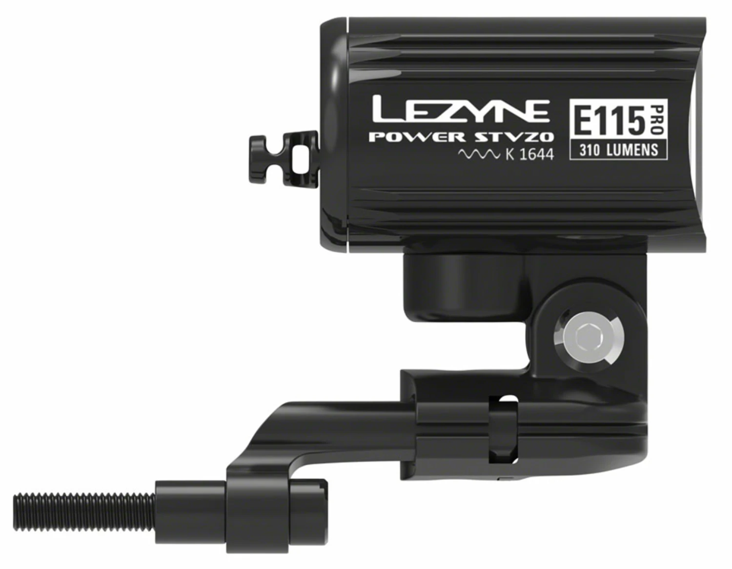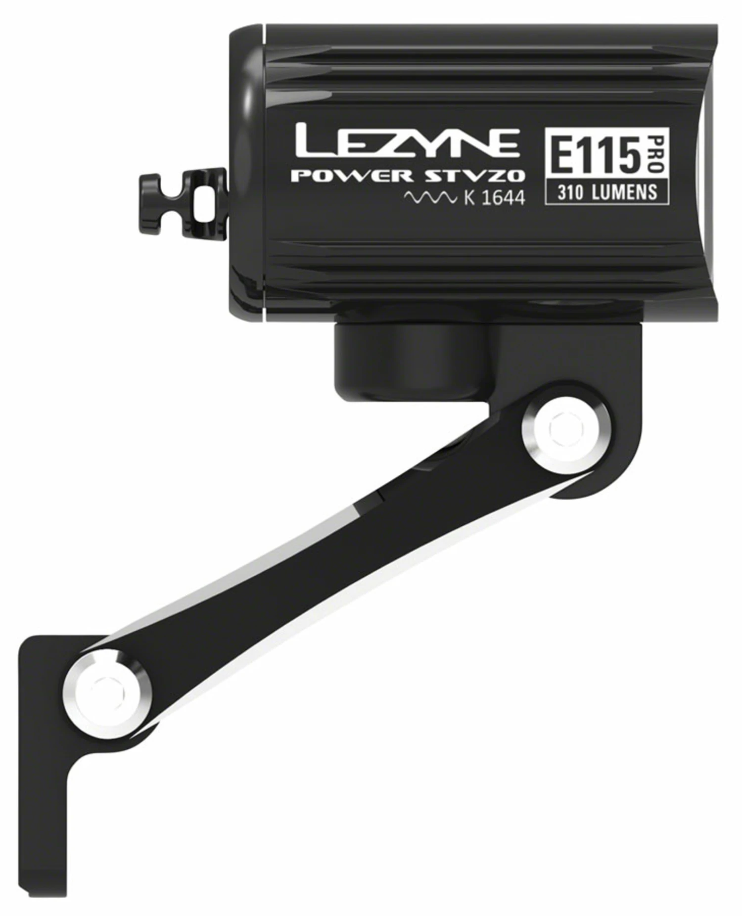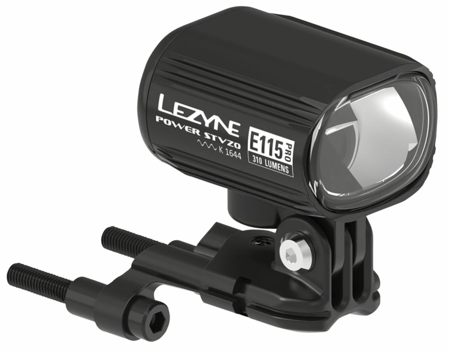 Lezyne Power STVZO Pro Headlight. German StVZO optimized lens with approved flood and long-range beam. High performance always-on LED delivers 310 lumens (115 Lux). Durable, heat-dissipating CNC machined aluminum construction. Auto day/night system extends battery runtime. E-bike compatible 6 – 12v input, 6w easily plugs into batteries from top makers including Bosch, Shimano and Yamaha. Includes X-Lock stem mount and CNC-machined aluminum fork mount. 130cm power cable included.