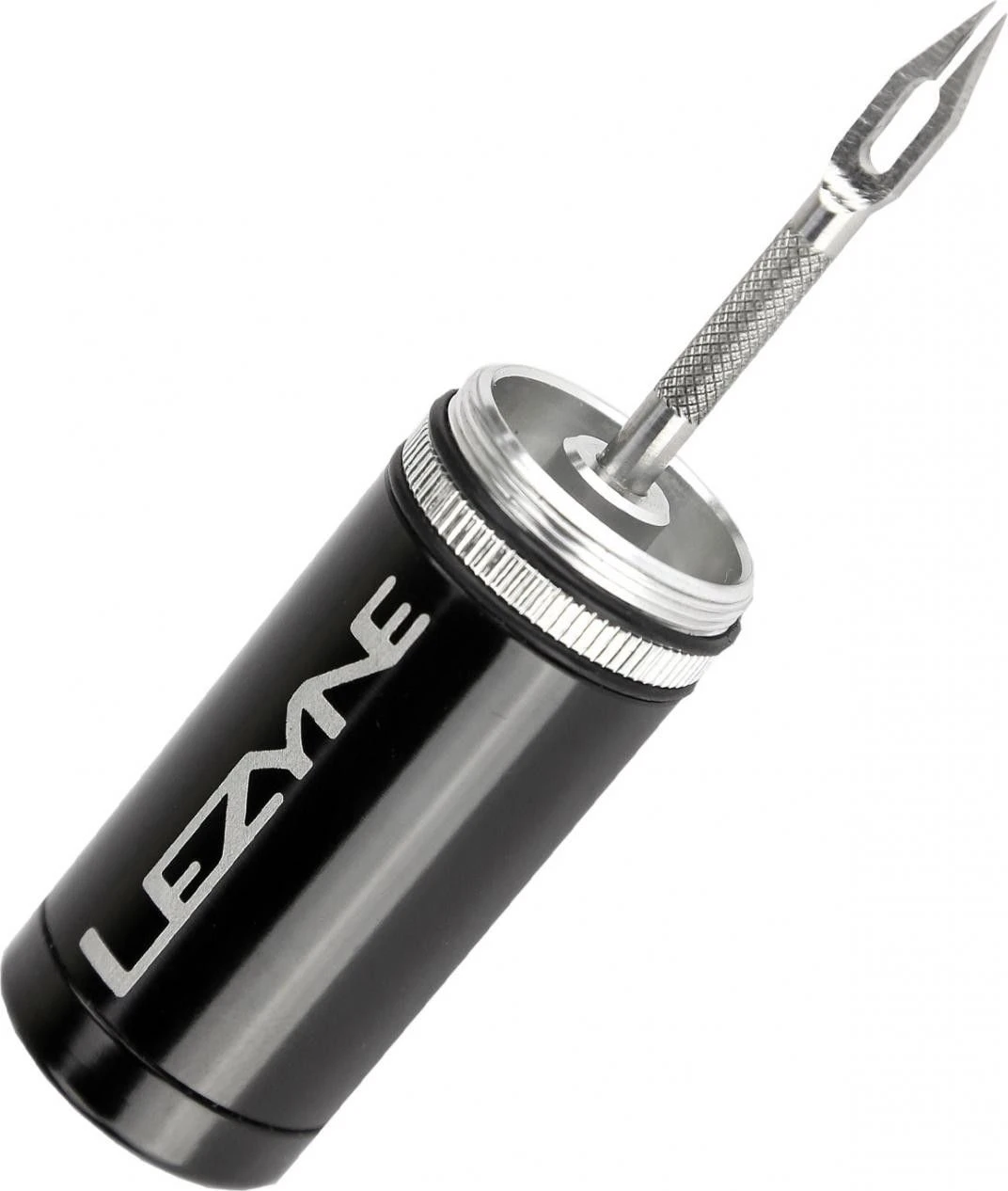 Compact tubeless tire repair kit with a machined aluminum storage box that doubles as a handle. Reamer and insertion tool. Includes 5 tire patches.