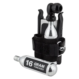 Compact, all-in-one CO2 and tire repair kit Includes Twin Speed Drive, two threaded 16g or 25g CO2 cartridges and Smart Kit Twin Slip-Fit head presses onto Presta and Schrader valves Custom neoprene/velcro strap secures all items together Kit easily fits in most packs, jersey pockets and on seat posts Cartridge Type: Threaded Head Type: PV/SV Color: Black/Silver Includes: 2 – 16g Size: 16g Kit